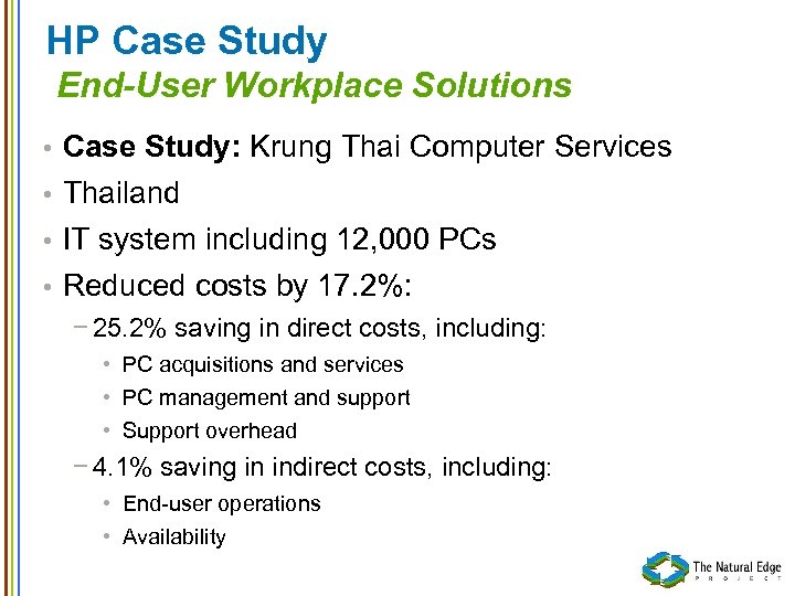 HP Case Study End-User Workplace Solutions • Case Study: Krung Thai Computer Services • Thailand IT system including 12, 000 PCs • Reduced costs by 17. 2%: • − 25. 2% saving in direct costs, including: • PC acquisitions and services • PC management and support • Support overhead − 4. 1% saving in indirect costs, including: • End-user operations • Availability