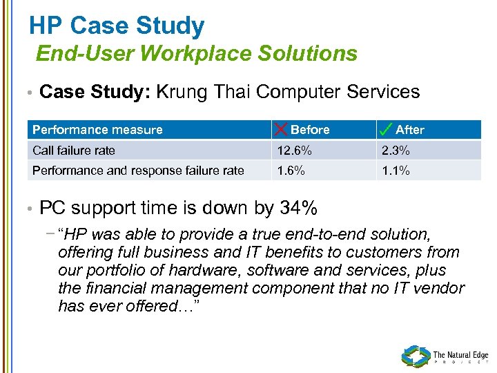 HP Case Study End-User Workplace Solutions • Case Study: Krung Thai Computer Services Performance measure Before After Call failure rate 12. 6% 2. 3% Performance and response failure rate 1. 6% 1. 1% • PC support time is down by 34% − “HP was able to provide a true end-to-end solution, offering full business and IT benefits to customers from our portfolio of hardware, software and services, plus the financial management component that no IT vendor has ever offered…”