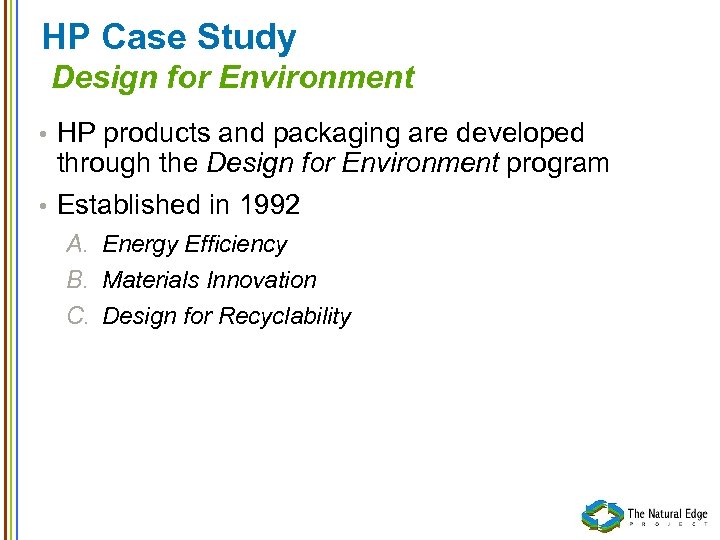 HP Case Study Design for Environment HP products and packaging are developed through the Design for Environment program • Established in 1992 • A. Energy Efficiency B. Materials Innovation C. Design for Recyclability