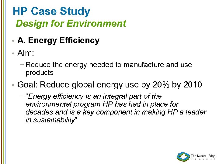 HP Case Study Design for Environment • A. Energy Efficiency • Aim: − Reduce the energy needed to manufacture and use products • Goal: Reduce global energy use by 20% by 2010 − “Energy efficiency is an integral part of the environmental program HP has had in place for decades and is a key component in making HP a leader in sustainability”