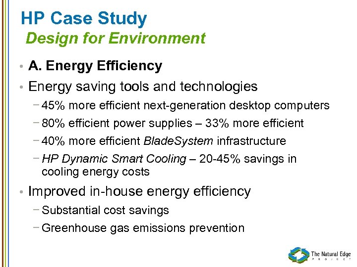 HP Case Study Design for Environment • A. Energy Efficiency • Energy saving tools and technologies − 45% more efficient next-generation desktop computers − 80% efficient power supplies – 33% more efficient − 40% more efficient Blade. System infrastructure − HP Dynamic Smart Cooling – 20 -45% savings in cooling energy costs • Improved in-house energy efficiency − Substantial cost savings − Greenhouse gas emissions prevention