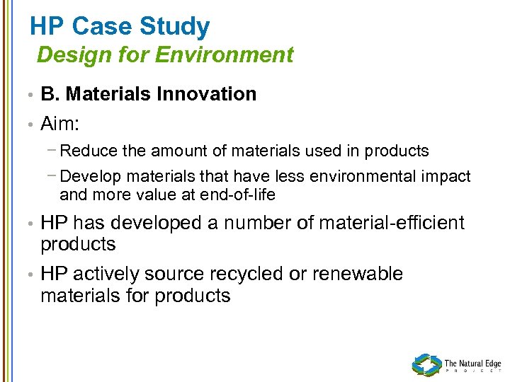 HP Case Study Design for Environment • B. Materials Innovation • Aim: − Reduce the amount of materials used in products − Develop materials that have less environmental impact and more value at end-of-life • HP has developed a number of material-efficient products • HP actively source recycled or renewable materials for products