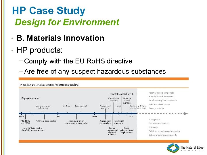 HP Case Study Design for Environment • B. Materials Innovation • HP products: − Comply with the EU Ro. HS directive − Are free of any suspect hazardous substances