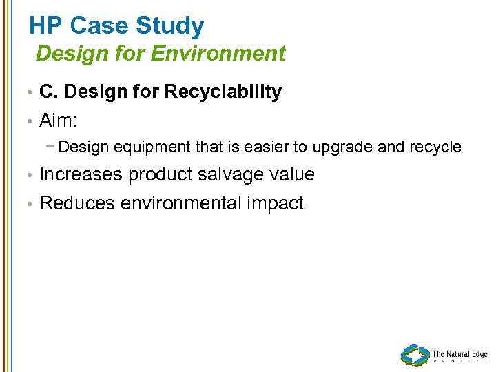 HP Case Study Design for Environment • C. Design for Recyclability • Aim: − Design equipment that is easier to upgrade and recycle Increases product salvage value • Reduces environmental impact •