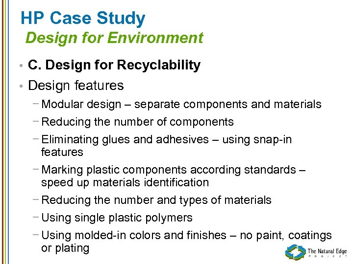 HP Case Study Design for Environment • C. Design for Recyclability • Design features − Modular design – separate components and materials − Reducing the number of components − Eliminating glues and adhesives – using snap-in features − Marking plastic components according standards – speed up materials identification − Reducing the number and types of materials − Usingle plastic polymers − Using molded-in colors and finishes – no paint, coatings or plating