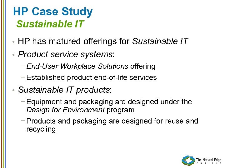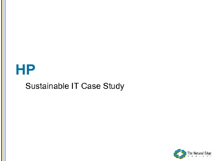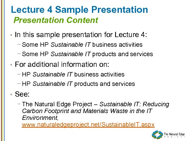 Lecture 4 Sample Presentation Content • In this sample presentation for Lecture 4: − Some HP Sustainable IT business activities − Some HP Sustainable IT products and services • For additional information on: − HP Sustainable IT business activities − HP Sustainable IT products and services • See: − The Natural Edge Project – Sustainable IT: Reducing Carbon Footprint and Materials Waste in the IT Environment, www. naturaledgeproject. net/Sustainable. IT. aspx