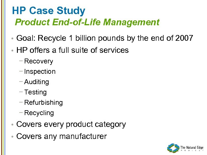 HP Case Study Product End-of-Life Management • Goal: Recycle 1 billion pounds by the end of 2007 • HP offers a full suite of services − Recovery − Inspection − Auditing − Testing − Refurbishing − Recycling Covers every product category • Covers any manufacturer •