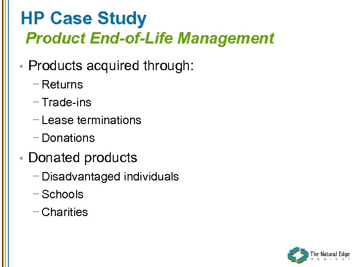 HP Case Study Product End-of-Life Management • Products acquired through: − Returns − Trade-ins − Lease terminations − Donations • Donated products − Disadvantaged individuals − Schools − Charities