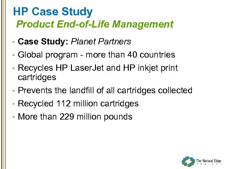 HP Case Study Product End-of-Life Management • Case Study: Planet Partners • Global program - more than 40 countries Recycles HP Laser. Jet and HP inkjet print cartridges • Prevents the landfill of all cartridges collected • Recycled 112 million cartridges • More than 229 million pounds •