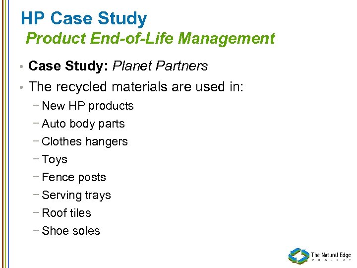 HP Case Study Product End-of-Life Management • Case Study: Planet Partners • The recycled materials are used in: − New HP products − Auto body parts − Clothes hangers − Toys − Fence posts − Serving trays − Roof tiles − Shoe soles
