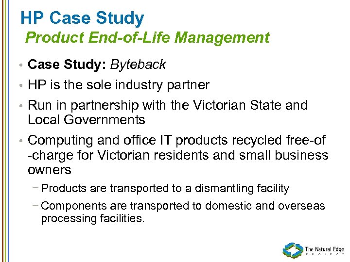 HP Case Study Product End-of-Life Management • Case Study: Byteback • HP is the sole industry partner Run in partnership with the Victorian State and Local Governments • Computing and office IT products recycled free-of -charge for Victorian residents and small business owners • − Products are transported to a dismantling facility − Components are transported to domestic and overseas processing facilities.