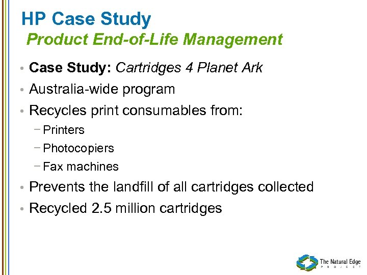 HP Case Study Product End-of-Life Management • Case Study: Cartridges 4 Planet Ark • Australia-wide program • Recycles print consumables from: − Printers − Photocopiers − Fax machines Prevents the landfill of all cartridges collected • Recycled 2. 5 million cartridges •