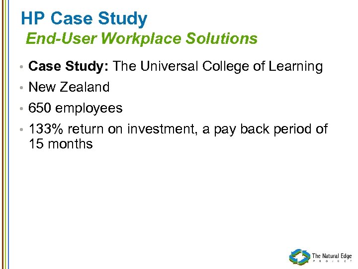HP Case Study End-User Workplace Solutions • Case Study: The Universal College of Learning • New Zealand 650 employees • 133% return on investment, a pay back period of 15 months •