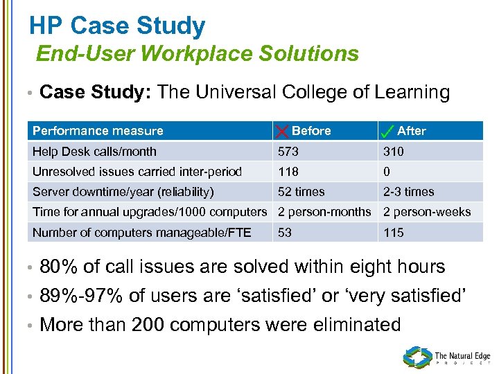 HP Case Study End-User Workplace Solutions • Case Study: The Universal College of Learning Performance measure Before After Help Desk calls/month 573 310 Unresolved issues carried inter-period 118 0 Server downtime/year (reliability) 52 times 2 -3 times Time for annual upgrades/1000 computers 2 person-months 2 person-weeks Number of computers manageable/FTE 53 115 80% of call issues are solved within eight hours • 89%-97% of users are ‘satisfied’ or ‘very satisfied’ • More than 200 computers were eliminated •