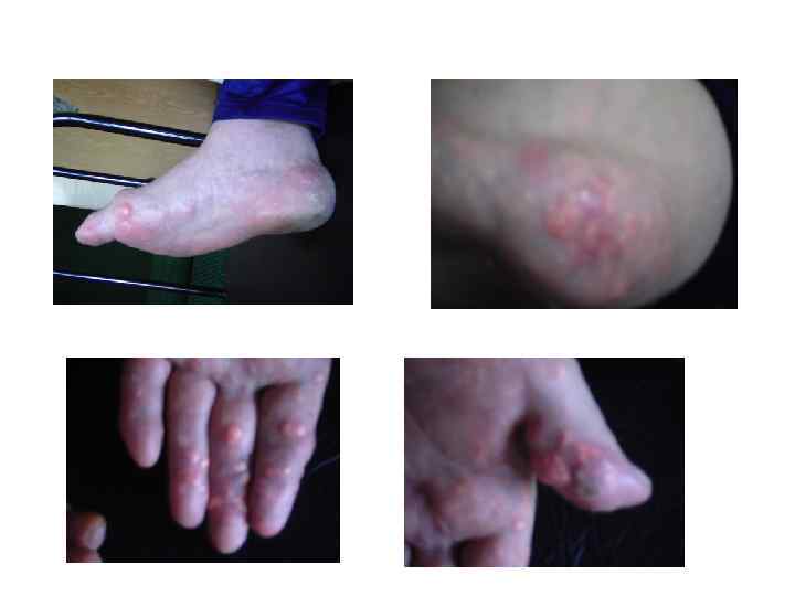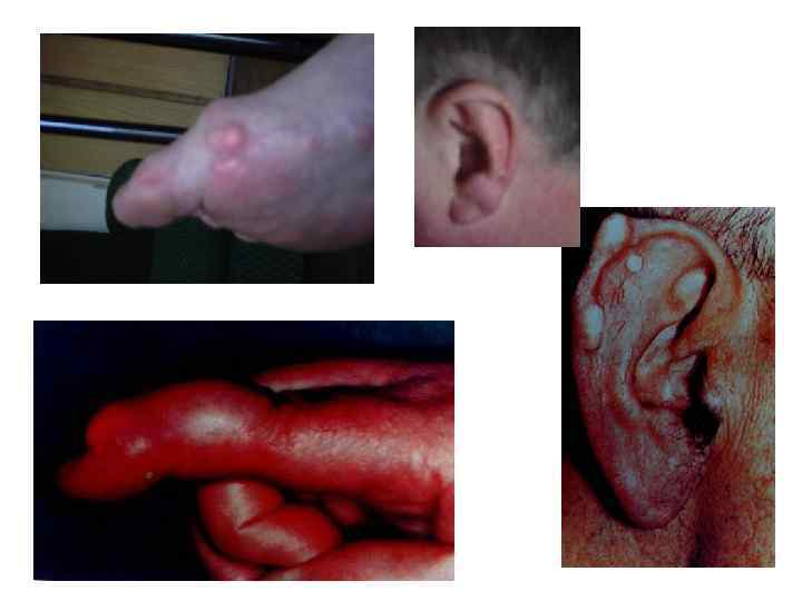 ТОФУСЫ • Через 4 -8 лет (суставы, сухожилия, ушные раковины, апоневроз черепных мышц) • Безболезненные, средней плотности п/к бугристые образования • Отложения микрокристаллов мочевой кислоты • Могут вскрываться, выделяя белую крошковидную массу • Подагрическая почка (протеинурия, микрогематурия, почечная колика)