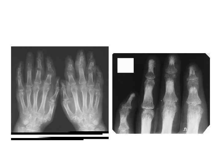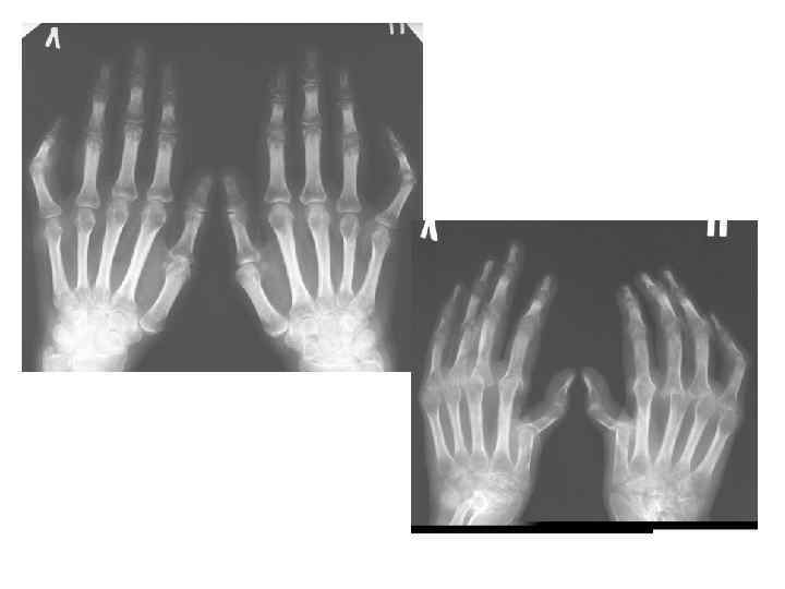 Пересмотренные диагностические критерии РА (ARA 1987) • • Утренняя скованность (не менее 1 часа) Артрит 3 х или более суставных зон Артрит суставов кистей Симметричный артрит Ревматоидные узелки Ревматоидный фактор Рентгенологические изменения 4 из 7, 1 -4 не менее 6 недель