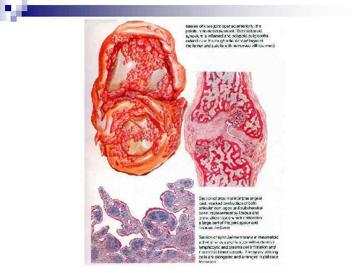 Пролиферация и палисадообразная структура синовиоцитов кроющего слоя, ангиоматоз, васкулит, отек стромы, лимфо-макрофагальная и плазмоклеточная инфильтрация, пролиферация фибробластов.