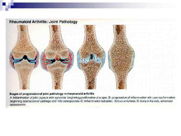 Критерии диагностики Ревматоидного артрита 2010 Критерии 0 баллов 1 балл 2 балла 3 балла «Крупные суставы» (плечи, локти, бедра, колени и лодыжки) 1 сустав 2 -10 суставо в «Малые суставы» (фаланговые, проксимальные межфаланговые, с второго по пятый плюснефаланговые суставы, межфаланговые суставы пальцев и запястья) - - 1 -3 суставов 4 -10 суставов Поражение более 10 суставов в том числе 1 «большого» – 5 баллов ревматоидный фактор (РФ) и тест на аутоантитела (anti-citrullinated protein antibody test, ACPA) Отриц. РФ, отриц. ACPA СРБ и СОЭ норма Слабо положит. (менее чем в 3 раза) РФ и ACPA Повыш ение СОЭ Резко положит. РФ или ACPA - -