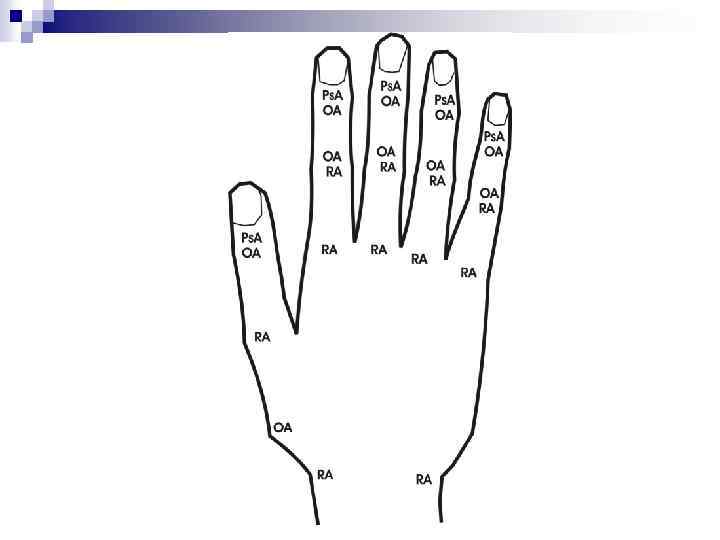 Псориатический артрит 1. Поражение дистальных межфаланговых суставов кистей и стоп (горизонтальный тип поражения) 2. Одновременное поражение 3 -х суставов одного пальца (осевое поражение) 3. Раннее вовлечение в процесс пальцев стоп 4. Талалгии 5. Наличие новых псориатических высыпаний или поражение ногтей 6. Случаи псориаза у родственников 7. Отрицательный РФ 8. Наличие остеолизиса 9. Сакроилеит 10. Развитие паравертебральных оссификаций Диагноз определенный: 3 критерия положительных, из них обязательно 5, 6, 8.