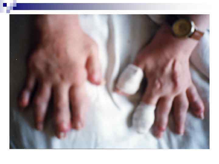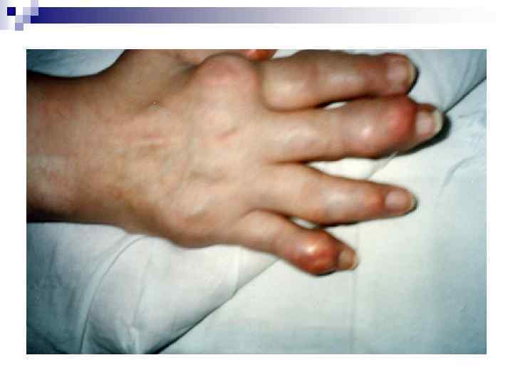 Синдром Рейтера при ВИЧ n n n n Эрозивные и остеолитические деструкции суставов Сочетание олигоартрита и уретрита Дактилиты Энтезопатии, подошвенный фасциит Изменения кожи и ногтей Поражения слизистых оболочек (конъюнктивит, стоматит, баланит) и осевого скелета (сакроилеит) наблюдаются редко HLA B 27+/HLAB 27 -, HLAB 13, HLAB 17 (B 57, B 58) Calabrese L H, Kelley D M, Myers A et al. Rheumatic symptoms and the human immunodeficiency virus infection The influence of clinical and laboratory variable in a longitudinal cohort study Arthritis Rheum. 1991; 34: 257 -263