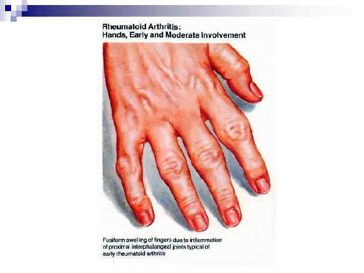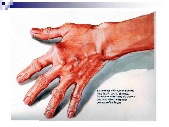 Диагностические критерии РА (1987 г. AСR). 1. 2. 3. 4. 5. 6. 7. 8. Утренняя скованность более 1 часа (минимум 6 недель) Припухлость не менее 3 -х суставов (минимум 6 недель) Припухлость лучезапястного, проксимального м/ф или пястно-фалангового суставов (минимум 6 недель) Симметричная припухлость (минимум 6 недель) Рентгенологические изменения кисти типичные для РА Подкожные узелки РФ Рентгенологические изменения, характерные для РА Больные должны соответствовать не менее 7 критериям (чувствительность – 93%, специфичность – 90%)