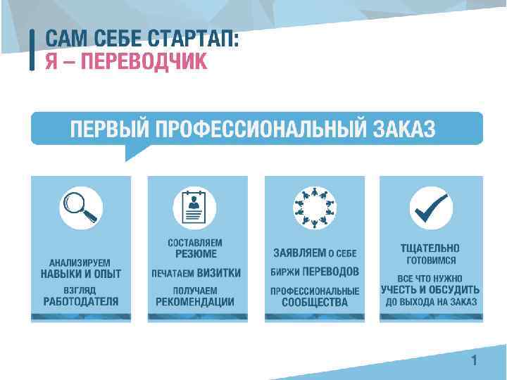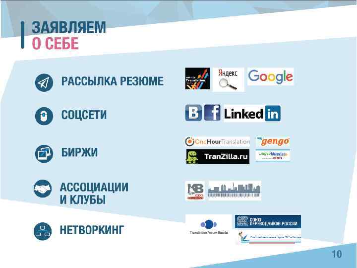 СТРОИМ КАРЬЕРУ • Публикации в научных или популярных изданиях, комментарии в студенческих СМИ и на сайтах • Вступление в профессиональные организации (отделение СПР, союз переводчиков СНГ) • Выступления на конференциях в ВУЗах, на ТФР • Активность в группах в соцсетях • Участие в проектах (Переводчики без границ, Лоскутное одеяло) • Волонтерство