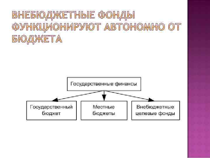 Внебюджетные фонды - совокупность финансовых средств, находящихся в распоряжении центральных или региональных органов власти и имеющих целевое назначение. Государственные внебюджетные фонды — целевые централизованные фонды финансовых ресурсов, формируемые за пределами государственного бюджета за счет обязательных платежей и отчислений юридических лиц и предназначенные для реализации конституционных прав граждан на пенсионное обеспечение, социальное обеспечение и страхование, охрану здоровья и медицинскую помощь.