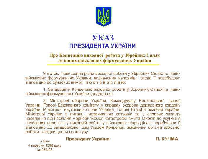 Методичні консультації щодо вивчення та реалізації Указу Президента України від 4 вересня 1998 року № 981/98 “Про Концепцію виховної роботи у Збройних Силах та інших військових формуваннях України” підготовлені управлінням виховної роботи Сухопутних військ України під керівництвом заступника Міністра оборони України командуючого Сухопутними військами Збройних Сил України генерал-полковника П. ШУЛЯКА. Відповідальний за випуск генерал-майор Л. ЖИШКО