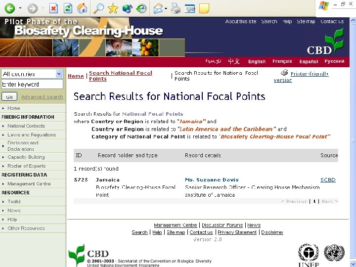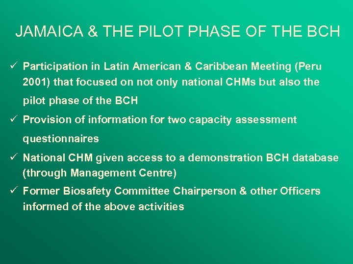 JAMAICA & THE PILOT PHASE OF THE BCH ü Participation in Latin American & Caribbean Meeting (Peru 2001) that focused on not only national CHMs but also the pilot phase of the BCH ü Provision of information for two capacity assessment questionnaires ü National CHM given access to a demonstration BCH database (through Management Centre) ü Former Biosafety Committee Chairperson & other Officers informed of the above activities