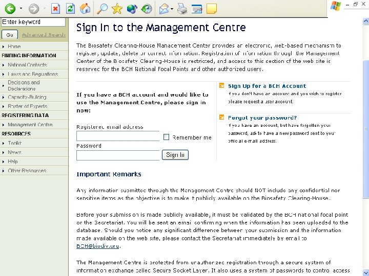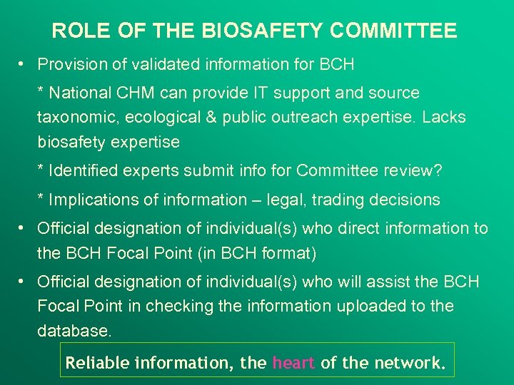 ROLE OF THE BIOSAFETY COMMITTEE • Provision of validated information for BCH * National CHM can provide IT support and source taxonomic, ecological & public outreach expertise. Lacks biosafety expertise * Identified experts submit info for Committee review? * Implications of information – legal, trading decisions • Official designation of individual(s) who direct information to the BCH Focal Point (in BCH format) • Official designation of individual(s) who will assist the BCH Focal Point in checking the information uploaded to the database. Reliable information, the heart of the network.