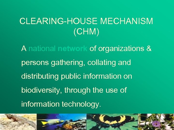 CLEARING-HOUSE MECHANISM (CHM) A national network of organizations & persons gathering, collating and distributing public information on biodiversity, through the use of information technology.