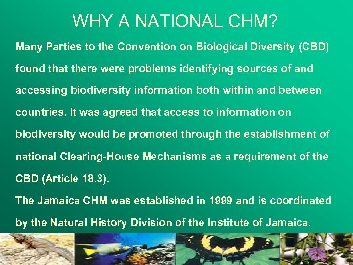 WHY A NATIONAL CHM? Many Parties to the Convention on Biological Diversity (CBD) found that there were problems identifying sources of and accessing biodiversity information both within and between countries. It was agreed that access to information on biodiversity would be promoted through the establishment of national Clearing-House Mechanisms as a requirement of the CBD (Article 18. 3). The Jamaica CHM was established in 1999 and is coordinated by the Natural History Division of the Institute of Jamaica.