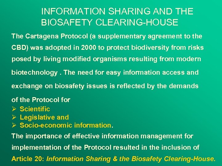 INFORMATION SHARING AND THE BIOSAFETY CLEARING-HOUSE The Cartagena Protocol (a supplementary agreement to the CBD) was adopted in 2000 to protect biodiversity from risks posed by living modified organisms resulting from modern biotechnology. The need for easy information access and exchange on biosafety issues is reflected by the demands of the Protocol for Ø Scientific Ø Legislative and Ø Socio-economic information. The importance of effective information management for implementation of the Protocol resulted in the inclusion of Article 20: Information Sharing & the Biosafety Clearing-House.