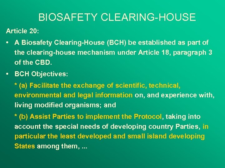 BIOSAFETY CLEARING-HOUSE Article 20: • A Biosafety Clearing-House (BCH) be established as part of the clearing-house mechanism under Article 18, paragraph 3 of the CBD. • BCH Objectives: * (a) Facilitate the exchange of scientific, technical, environmental and legal information on, and experience with, living modified organisms; and * (b) Assist Parties to implement the Protocol, taking into account the special needs of developing country Parties, in particular the least developed and small island developing States among them, . . .