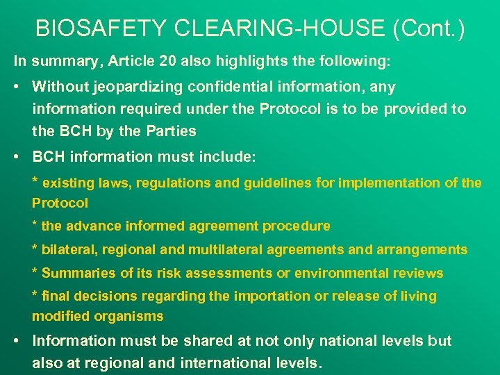 BIOSAFETY CLEARING-HOUSE (Cont. ) In summary, Article 20 also highlights the following: • Without jeopardizing confidential information, any information required under the Protocol is to be provided to the BCH by the Parties • BCH information must include: * existing laws, regulations and guidelines for implementation of the Protocol * the advance informed agreement procedure * bilateral, regional and multilateral agreements and arrangements * Summaries of its risk assessments or environmental reviews * final decisions regarding the importation or release of living modified organisms • Information must be shared at not only national levels but also at regional and international levels.
