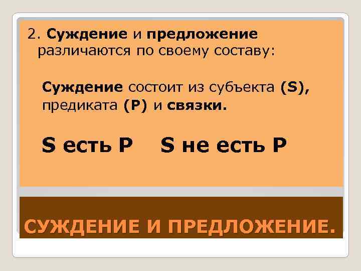 2. Суждение и предложение различаются по своему составу: Суждение состоит из субъекта (S), предиката (Р) и связки. S есть Р S не есть Р СУЖДЕНИЕ И ПРЕДЛОЖЕНИЕ.
