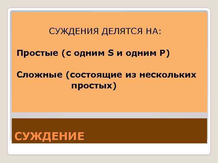 СУЖДЕНИЯ ДЕЛЯТСЯ НА: Простые (с одним S и одним Р) Сложные (состоящие из нескольких простых) СУЖДЕНИЕ