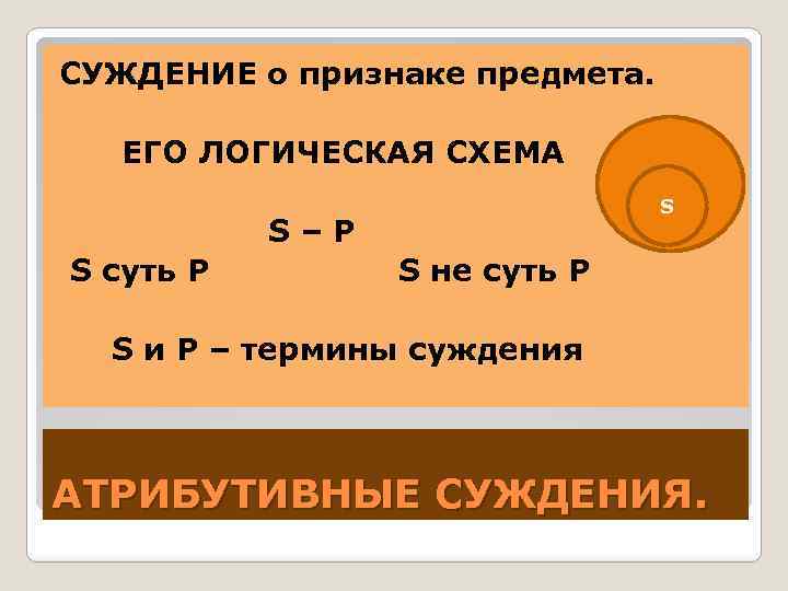 СУЖДЕНИЕ о признаке предмета. ЕГО ЛОГИЧЕСКАЯ СХЕМА РРРР S S–Р S суть Р S не суть Р S и Р – термины суждения АТРИБУТИВНЫЕ СУЖДЕНИЯ.