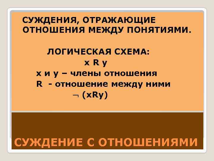 СУЖДЕНИЯ, ОТРАЖАЮЩИЕ ОТНОШЕНИЯ МЕЖДУ ПОНЯТИЯМИ. ЛОГИЧЕСКАЯ СХЕМА: х. Ry x и y – члены отношения R - отношение между ними (x. Ry) СУЖДЕНИЕ С ОТНОШЕНИЯМИ