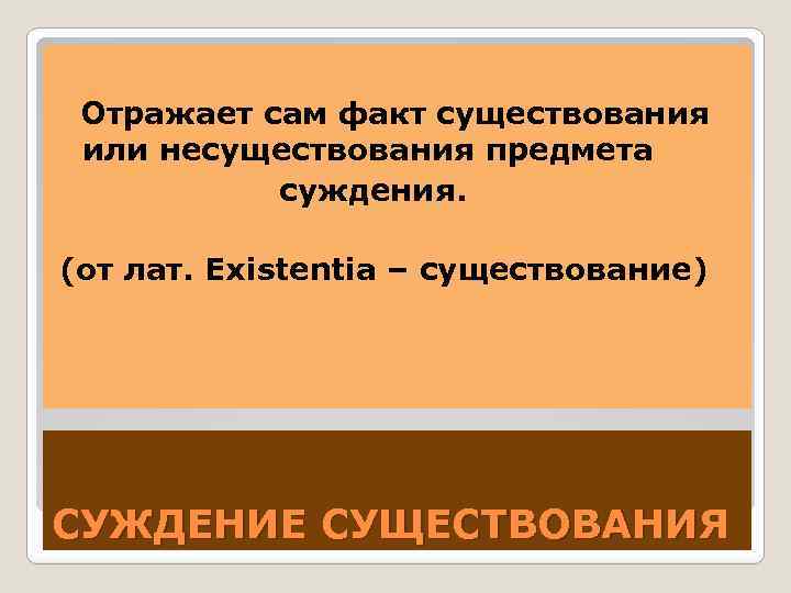 Отражает сам факт существования или несуществования предмета суждения. (от лат. Existentia – существование) СУЖДЕНИЕ СУЩЕСТВОВАНИЯ