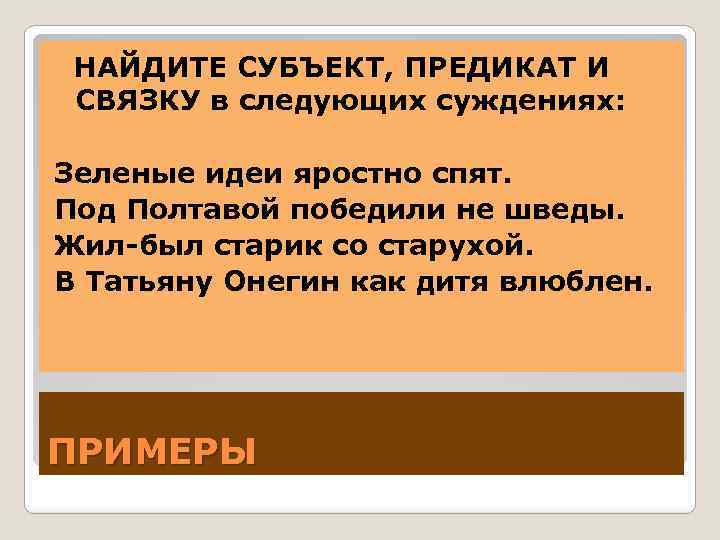НАЙДИТЕ СУБЪЕКТ, ПРЕДИКАТ И СВЯЗКУ в следующих суждениях: Зеленые идеи яростно спят. Под Полтавой победили не шведы. Жил-был старик со старухой. В Татьяну Онегин как дитя влюблен. ПРИМЕРЫ
