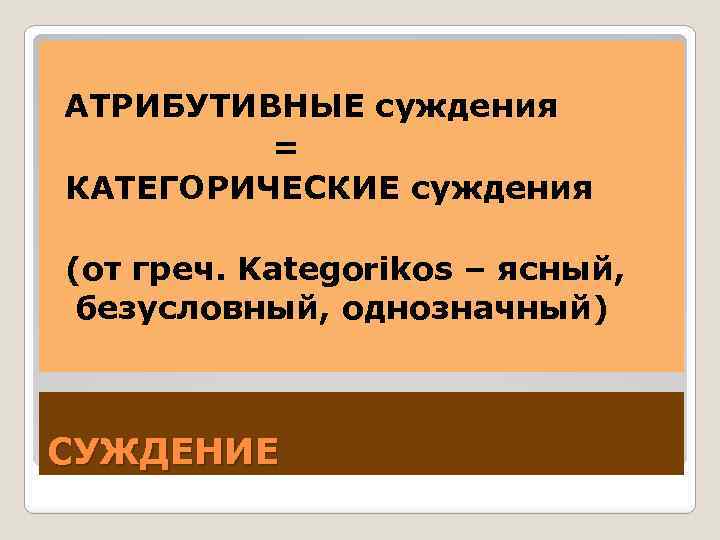 АТРИБУТИВНЫЕ суждения = КАТЕГОРИЧЕСКИЕ суждения (от греч. Kategorikos – ясный, безусловный, однозначный) СУЖДЕНИЕ