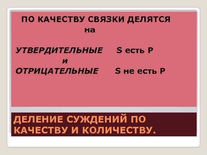 ПО КАЧЕСТВУ СВЯЗКИ ДЕЛЯТСЯ на УТВЕРДИТЕЛЬНЫЕ и ОТРИЦАТЕЛЬНЫЕ S есть Р S не есть Р ДЕЛЕНИЕ СУЖДЕНИЙ ПО КАЧЕСТВУ И КОЛИЧЕСТВУ.