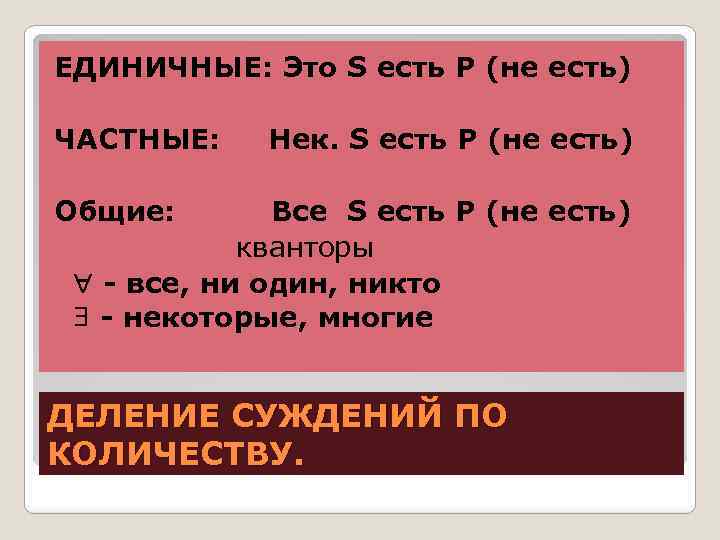ЕДИНИЧНЫЕ: Это S есть Р (не есть) ЧАСТНЫЕ: Нек. S есть Р (не есть) Общие: Все S есть Р (не есть) кванторы - все, ни один, никто - некоторые, многие ДЕЛЕНИЕ СУЖДЕНИЙ ПО КОЛИЧЕСТВУ.