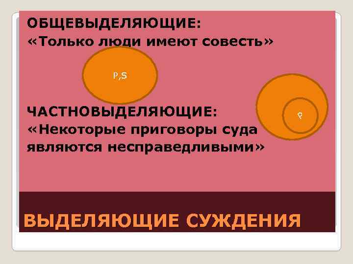 ОБЩЕВЫДЕЛЯЮЩИЕ: «Только люди имеют совесть» Р, S ЧАСТНОВЫДЕЛЯЮЩИЕ: «Некоторые приговоры суда являются несправедливыми» SS P ВЫДЕЛЯЮЩИЕ СУЖДЕНИЯ