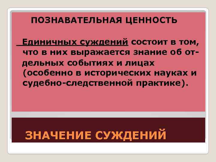 ПОЗНАВАТЕЛЬНАЯ ЦЕННОСТЬ Единичных суждений состоит в том, что в них выражается знание об отдельных событиях и лицах (особенно в исторических науках и судебно-следственной практике). ЗНАЧЕНИЕ СУЖДЕНИЙ