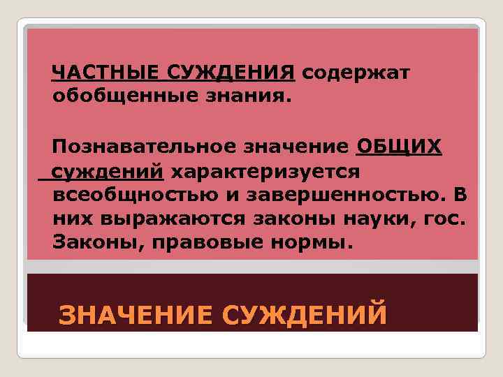 ЧАСТНЫЕ СУЖДЕНИЯ содержат обобщенные знания. Познавательное значение ОБЩИХ суждений характеризуется всеобщностью и завершенностью. В них выражаются законы науки, гос. Законы, правовые нормы. ЗНАЧЕНИЕ СУЖДЕНИЙ