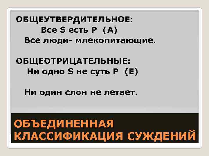 ОБЩЕУТВЕРДИТЕЛЬНОЕ: Все S есть Р (А) Все люди- млекопитающие. ОБЩЕОТРИЦАТЕЛЬНЫЕ: Ни одно S не суть Р (Е) Ни один слон не летает. ОБЪЕДИНЕННАЯ КЛАССИФИКАЦИЯ СУЖДЕНИЙ