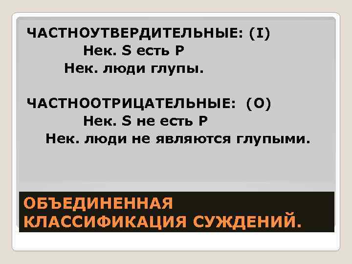 ЧАСТНОУТВЕРДИТЕЛЬНЫЕ: (I) Нек. S есть Р Нек. люди глупы. ЧАСТНООТРИЦАТЕЛЬНЫЕ: (О) Нек. S не есть Р Нек. люди не являются глупыми. ОБЪЕДИНЕННАЯ КЛАССИФИКАЦИЯ СУЖДЕНИЙ.
