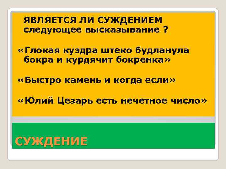 ЯВЛЯЕТСЯ ЛИ СУЖДЕНИЕМ следующее высказывание ? «Глокая куздра штеко будланула бокра и курдячит бокренка» «Быстро камень и когда если» «Юлий Цезарь есть нечетное число» СУЖДЕНИЕ